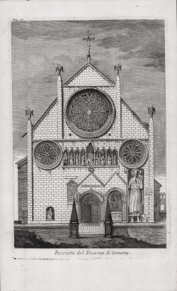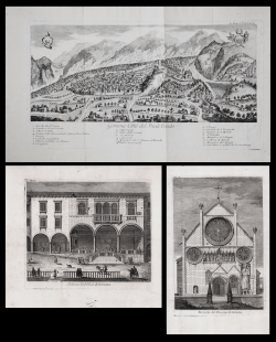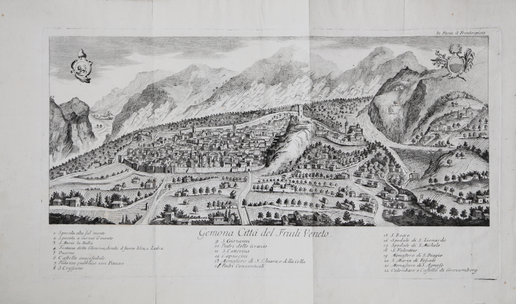 Veduta generale della città, del municipio e del duomo di Gemona; tre fogli tratti dal celebre e raro, Notizie di Gemona Antica Città nel Friuli di Gian Giuseppe Liruti, stampato a Venezia presso Angelo Pasinelli nel 1771.