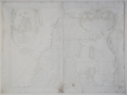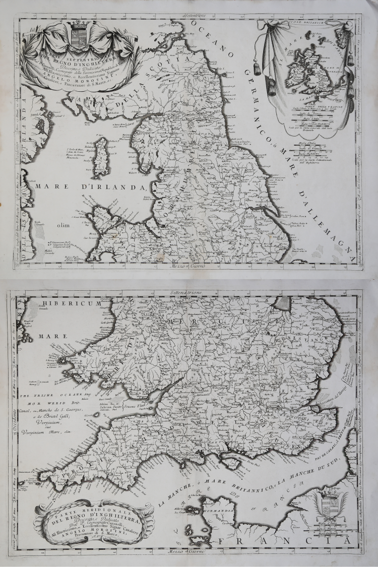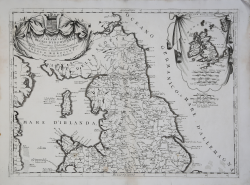 Una splendida mappa delle Isole Britanniche, incisa su due fogli, con quattro grandi cartigli e una tabella con contee, città, ecc. Mostra città, montagne, fiumi, laghi, isole, baie, chiese e altri elementi caratteristici. Una delle mappe decorative di grande formato del XVII secolo più ricercate dell'Inghilterra.