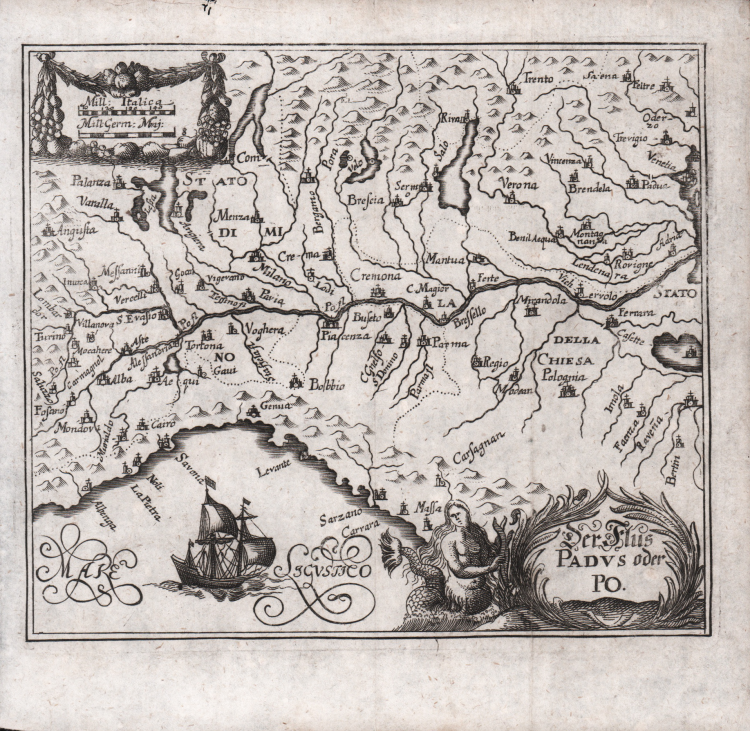 Rara carta del Corso del Po, tratta da “Roma Regina Mundi, oder die hocstberuhmteste in Welshland ligende, Grosse, der Welt und Christenheit HaupStatt und Konigin Rom...” pubblicata a Augsburg nel 1686 da Jacob Enderlin e Thomas Astaler. Si tratta di un volume, riccamente illustrato, che voleva essere una breve guida per i tedeschi in viaggio per l’Italia, con succinte indicazioni delle città.