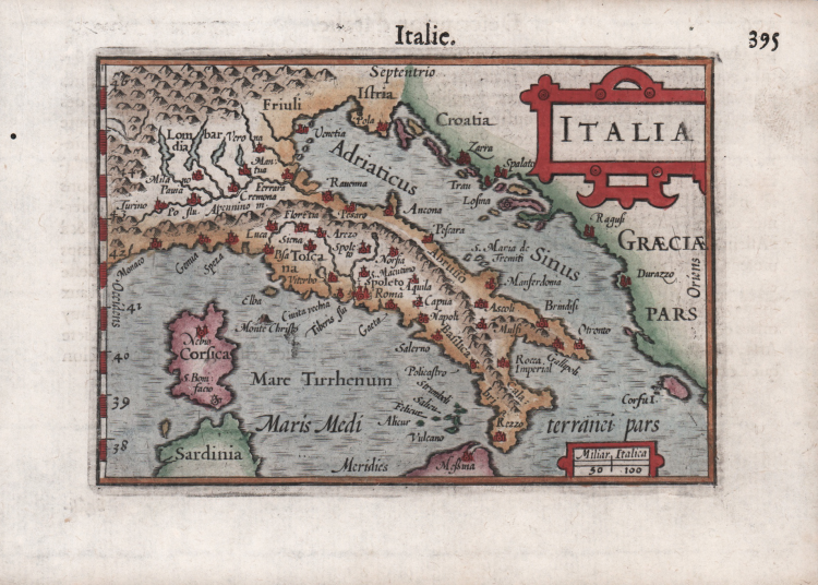 Carta geografica in miniatura per la prima volta pubblicata nel "Caert-thresoor" di Barent Langenes edito ad Amsterdam da Cornelis Claesz nel 1598. Esemplare dalla successiva ristampa - con testo francese - del 1609, denominata "Thrésor de Chartes contenant les Tableux de tout les pays du monde, enrichi de belles descriptions, revue & augmenté" stampato a Francoforte da Matthias Becker per conto dell’editore Henry Laurent.