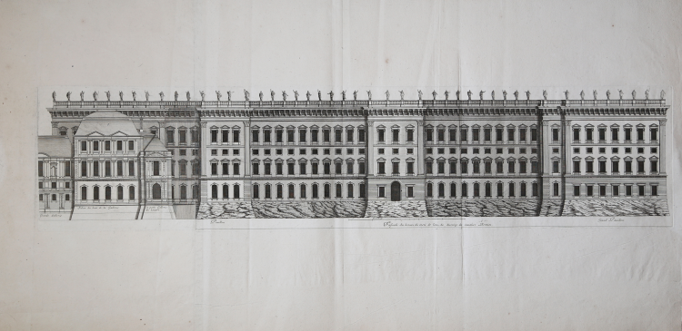 Tavola architettonica tratta da Recueil des plans, profils, et élévations de plusieurs palais, chasteaux, églises, sépultures, grotes et hostels bâtis dans Paris, la serie denominate anche “Le Petit Marot”, pubblicata a Parigi intorno al 1659.