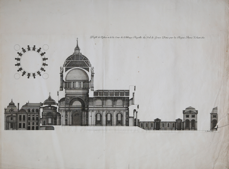 Tavola architettonica tratta da Recueil des plans, profils, et élévations de plusieurs palais, chasteaux, églises, sépultures, grotes et hostels bâtis dans Paris, la serie denominate anche “Le Petit Marot”, pubblicata a Parigi intorno al 1659.