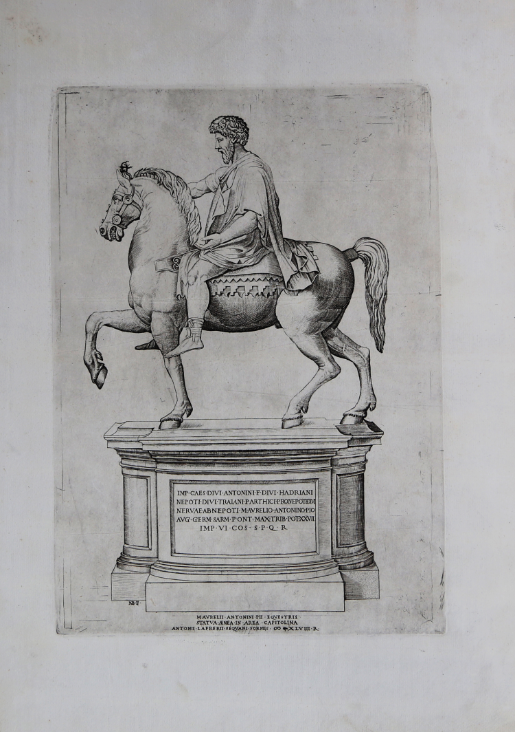 Iscritto e firmato in basso al centro: «M[ARCI] AVRELII ANTONINI PII EQVESTRIS / STATVA AENEA IN AREA CAPITOLINA / ANTONII LAFRERII SEQVANI FORMIS - ∞ DXLVIII R»