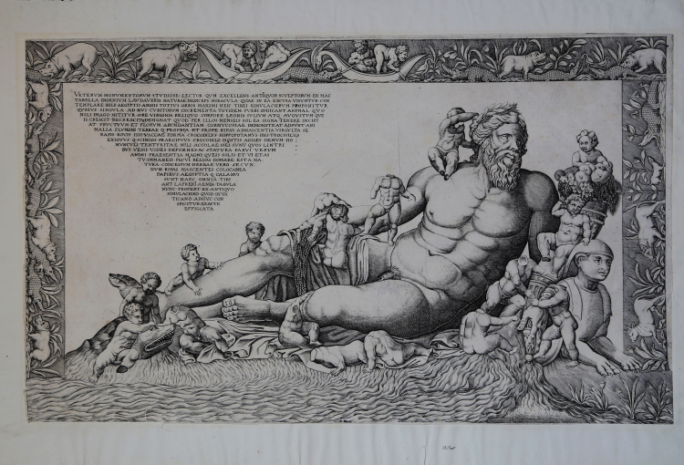 Bulino, 1545 circa, in alto a sinistra la lunga dedica al lettore firmata da Antonio Lafreri: VETERUM MONUMENTORUM STUDIOSE LECTOR QUM EXCELLENS ANTIQUOR SCULPTORUM EX HAC TABELLA INGENIUM LAUDAVERIS NATURAE DEINCEPS MIRACULA QUAE IN EA EXCUSA VISUNTUR CONTEMPLARE NILI AEGYPTII AMNIS TOTIUS ORBIS MAXIMI HEIC TINEI SIMULACHRUM PROPONITUR…...[…] ANT LAFRERI AENEA TABULA NUNC PROFERT EX ANTIQUO SIMULACHRO QUOD IN VATICANO ADHUC CONSPICITUR EXACTE EFFIGIATA'.