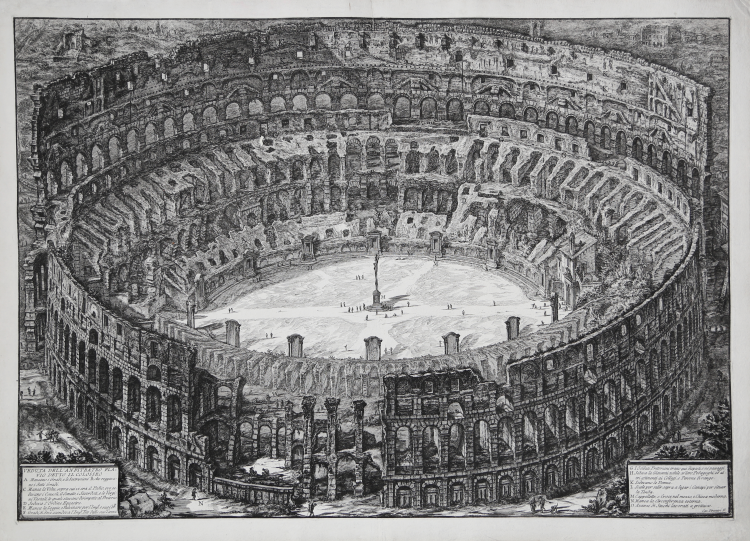Il Colosseo visto dall'alto, inusuale per quei tempi. L'abilità del Piranesi è stata proprio nel riuscire ad interpretare la veduta dall'alto, pur non potendola visualizzare. Le iscrizioni raccolte negli angoli in basso riportano: "A. Mancano i Gradi, e le Sostruzioni B. che reggevano i detti Gradi C. Manca la Volta, sopra cui vi era il Podio, ove sedevano i Consoli, il Senato, i Sacerdoti, e le Vergine Vestali, le quali stevano dirimpetto al Pretorio. D. Sedeva l'Ordine Equestre. E. Manca la Loggia, o Pulvinare per l'Imp.e sua Cor.te F. Gradi, di dove scendeva l'Imp.e Tito dalle sue Terme. G. I Soldati Pretoriani erano quí disposti, e ne'passaggi. H. Sedeva la Gioventú nobile co'loro Pedagoghi, ed al-tri attinenti ai Collegi, e Persone di rango. K. Sedevano le Donne. L. Scale per salir sopra a legar i Canapi per situar la Tenda. M. Capellette, e Croce nel mezzo, e chiesa moderna. N. Manca la circonferenza esterna. O. Avanzi di stuchi lavorati a grottesco".