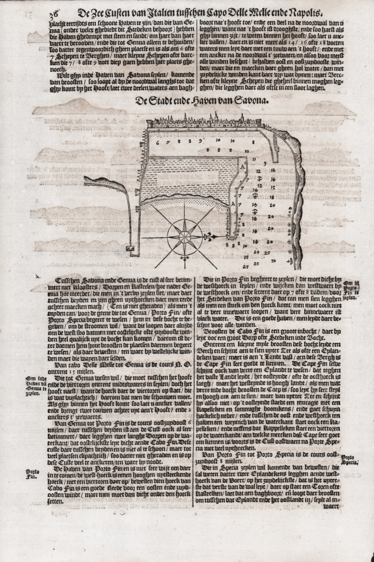 Pianta xilografica del porto inserita in una pagina di testo pubblicata nel terzo ed ultimo volume dell’atlante nautico del Mediterraneo Der Vyerighe Colom di Jacob Aertsz Colom, edizione olandese, pubblicata ad Amsterdam nel 1638.
