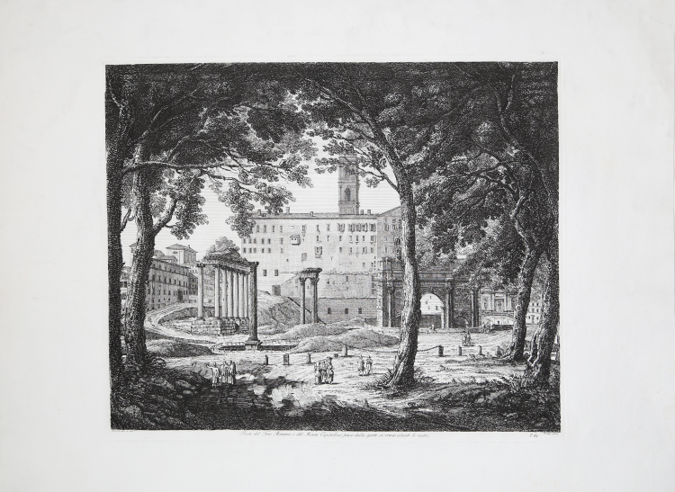 Tavola tratta dalla serie delle Antichità Romane, serie composta di 101 tavole, che viene realizzata con il ricavato della e vendita dei rami della Raccolta di cinquanta principali vedute di antichità tratte da scavi fatti in Roma in questi ultimi tempi divise in 40 vedute edita nel 1817.