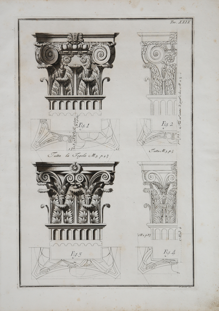 Grande tavola raffigurante degli ordini architettonici, opera di Mario Gioffedo che la pubblica nel raro trattato Dell’Architettura di Mario Geoffredo Architetto Napoletano, pubblicata a Napoli nel 1768.