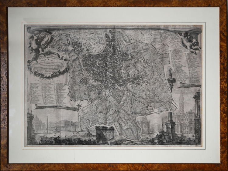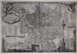 Celebre pianta di Roma, incisa da Giovanni Battista Nolli e Carlo Nolli, magnificamente arricchita da elementi decorativi incisi da Giovanni Battista Piranesi.