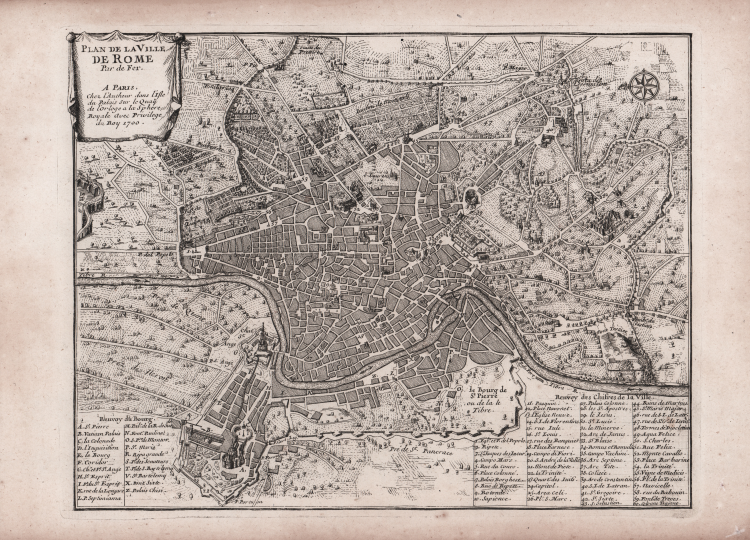 Pianta dettagliata di Roma, dall'Atlas Curieux di De Fer, basata sul grande rilievo di Giovan Battista Falda.