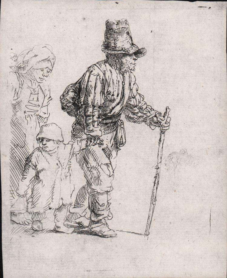Rembrandt raffigurava spesso mendicanti e "storpi", come questa famiglia di vagabondi che indossa abiti piuttosto antiquati per l'epoca. La contadina, raffigurata con dignità, porta un bambino sulla schiena, la cui testolina è appena visibile. Il bambino, condotto dal padre, sembra un moccioso. La figura dominante del contadino stesso appare decisa, persino provocatoria. Un mito romantico su Rembrandt è che abbia inciso così tanti mendicanti – più di trenta incisioni in totale – perché si sentiva lui stesso alienato dalla società. È vero che una volta si ritrasse come un mendicante, ma era più attratto dai volti espressivi, dagli abiti laceri e dall'andatura sgualcita di questi soggetti "infimi". Insolitamente per l'epoca, Rembrandt diede ai suoi mendicanti emozioni vere e volti individualizzati, apparentemente con l'intento di suscitare compassione nei suoi spettatori.