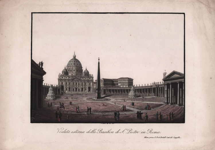 Veduta della Piazza San Pietro, finemente incisa ad acquaforte ed acquatinta e terminata ad acquarello da Giacomo Bussi.
