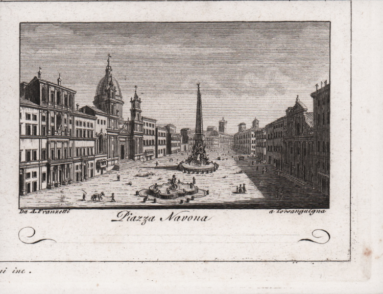Veduta tratta dalla celebre Raccolta di num. 320 Vedute sì antiche, che moderne della città di Roma... …Incise a bulino in N. 80 rami, In Roma Nella Calcografia di Agapito Franzetti a Torsanguigna Col Permesso.