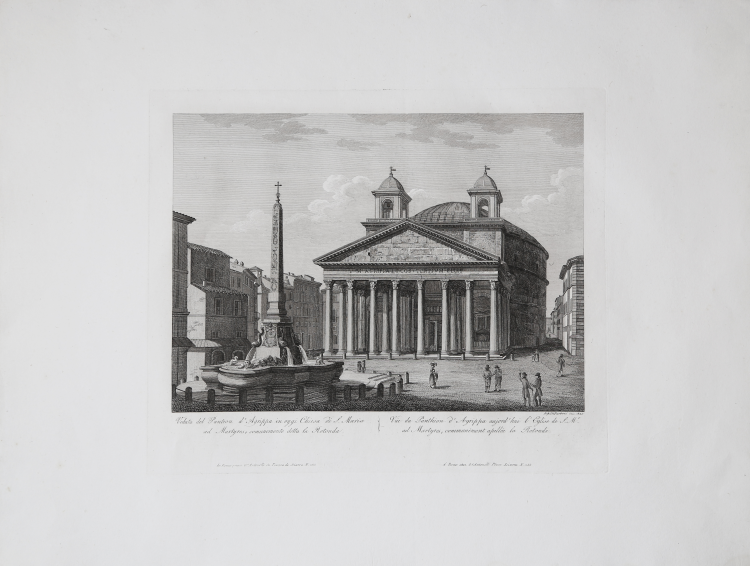 Veduta tratta dall’opera Nuova Raccolta delle principali vedute antiche e moderne dell’Alma città di Roma e sue vicinanze, incise a bulino da Pietro ed Achille Parboni e Pietro Ruga l’anno 1830, edita da Giacomo Antonelli con imprint Roma presso Giacom.o Antonelli in Via del Corso alle Convertite num 179B.