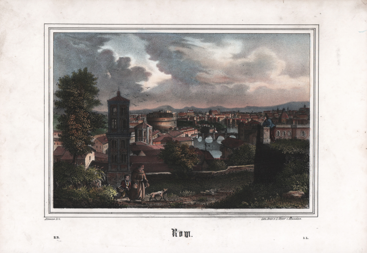 Veduta panoramica dal Gianicolo della città di Roma, pubblicata dalla litografia Oeser in Neusalza-Spremberg (Sassonia), circa 1847.