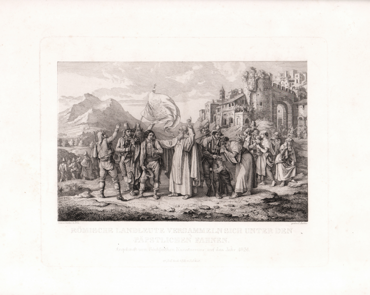 Firmata in basso a destra Firmato in basso a destra "gest. v. L. Richter". Da un dipinto di Dietrich Wilhelm Lindau. Il titolo recita “I contadini romani si riuniscono sotto le bandiere papali”.