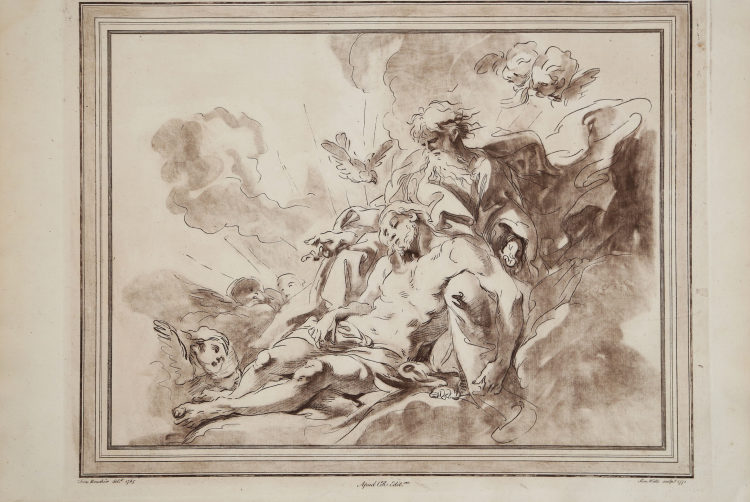 Dio, seduto, sostiene il corpo senza vita di Cristo, con lo Spirito Santo sotto forma di colomba che aleggia sopra di esso; tratto da un disegno di François Boucher.