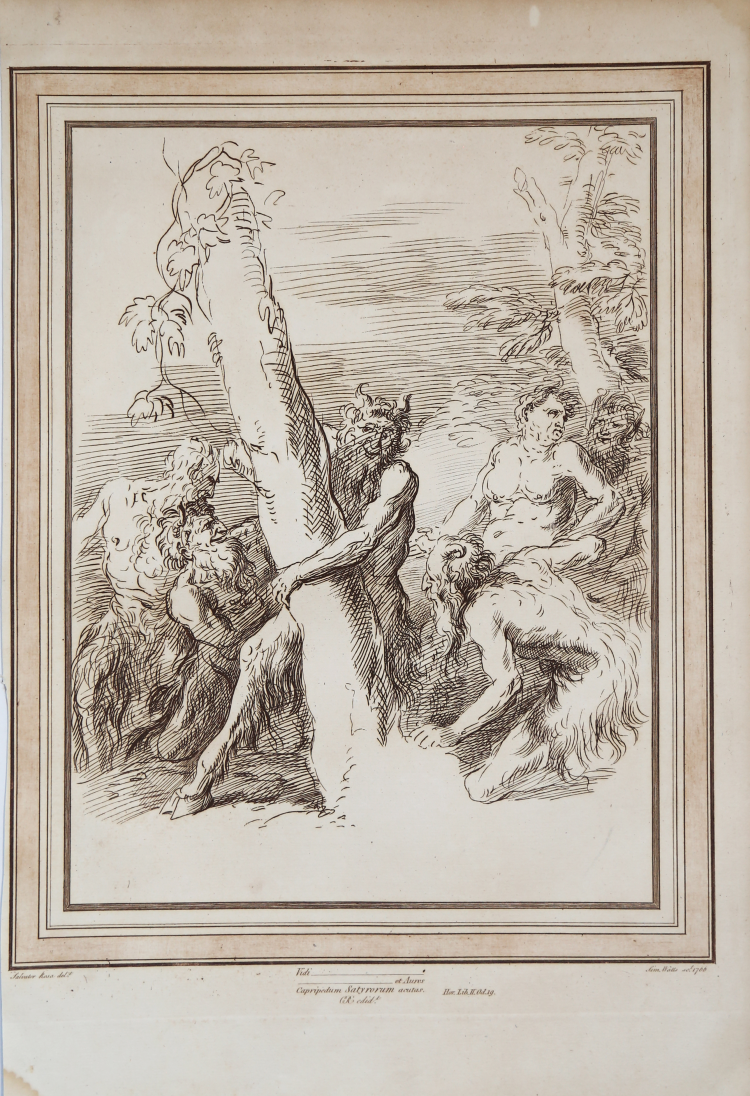 Satiro e sileno nella foresta, un satiro al centro abbraccia un albero; da un disegno di Salvator Rosa.