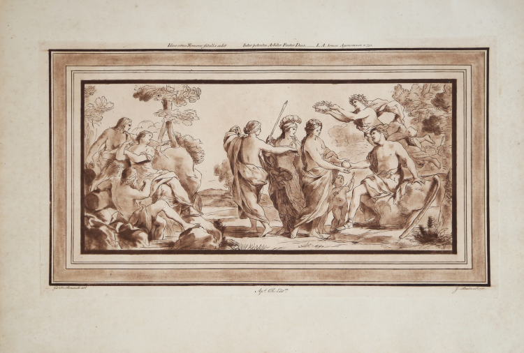 Paride in piedi sulla destra con un angelo che regge una corona d'alloro sopra i suoi capelli, mentre raccoglie un frutto che le porge un giovane; un ragazzino tra loro con arco e frecce; in cornice rettangolare che imita un passe-partout. Da un disegno di Giovanni Francesco Romanelli.