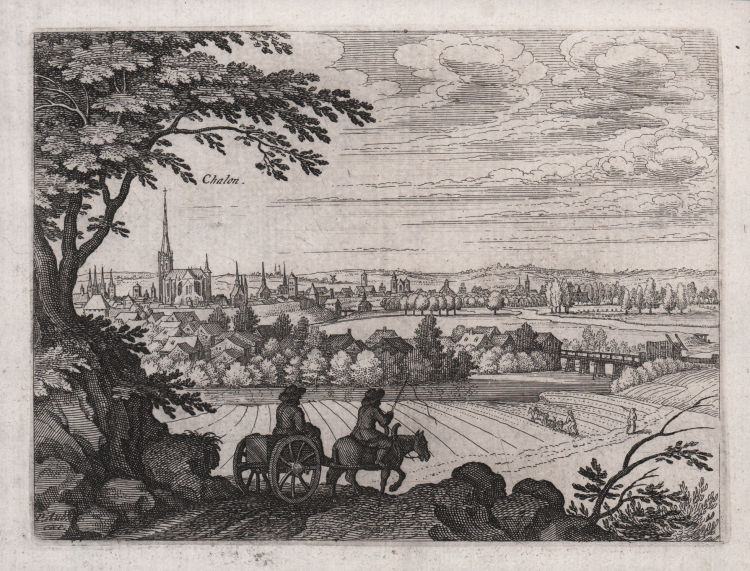 Veduta della campagna vicino a Châlons-en-Champagne, nel dipartimento della Marna, molto probabilmente pubblicata da Peter Aubry (1596-1666), intorno al 1620. Verso l'alto sulla sinistra titolo "Chalon", in basso a sinistra excudit "P. Aub. exc.".