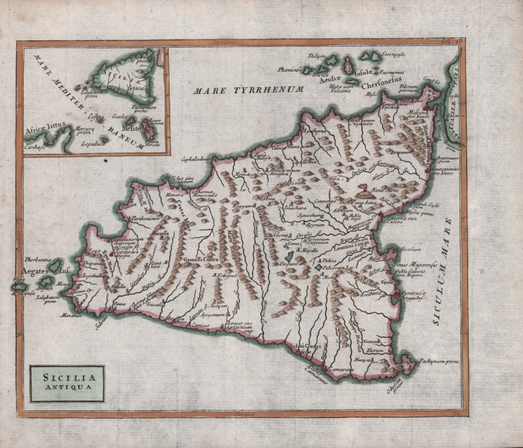 Carta della Sicilia antica di John Senex, tratta da Christophori Cellarii Smalcaldensis geographia antiqua recognita denuo, & ad veterum novorumque scriptorum fidem, historicorum maxime, identidem castigat… stampato a Londra da Samuel Patrick nel 1786.