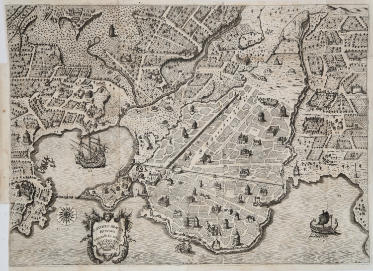 Magnifica pianta prospettica di Siracusa tratta dal libro di Giacomo Bonanni, Delle antiche Siracuse che contiene I due Libri della Siracusa illustrata da Giacomo Bonanni, stampato a Palermo da Giovanni Battista Aiccardo nel 1717 e illustrato dalle incisioni di Francesco Cichè, un incisore-editore di Palermo che produsse diversi rilievi, utilizzati prevalentemente per illustrare testi di carattere storico.