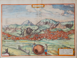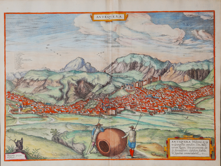 Veduta a volo d'uccello della città spagnola di Antequera, pubblicata nel secondo volume (1575) del Civitates Orbis Terrarum, il primo atlante devoto esclusivamente alle piante e vedute delle principali città del mondo. Stampato in sei volumi tra il 1572 ed il 1617 ebbe grande fortuna e diffusione, tanto che ne furono stampate diverse edizioni tradotte in latino, tedesco e francese.