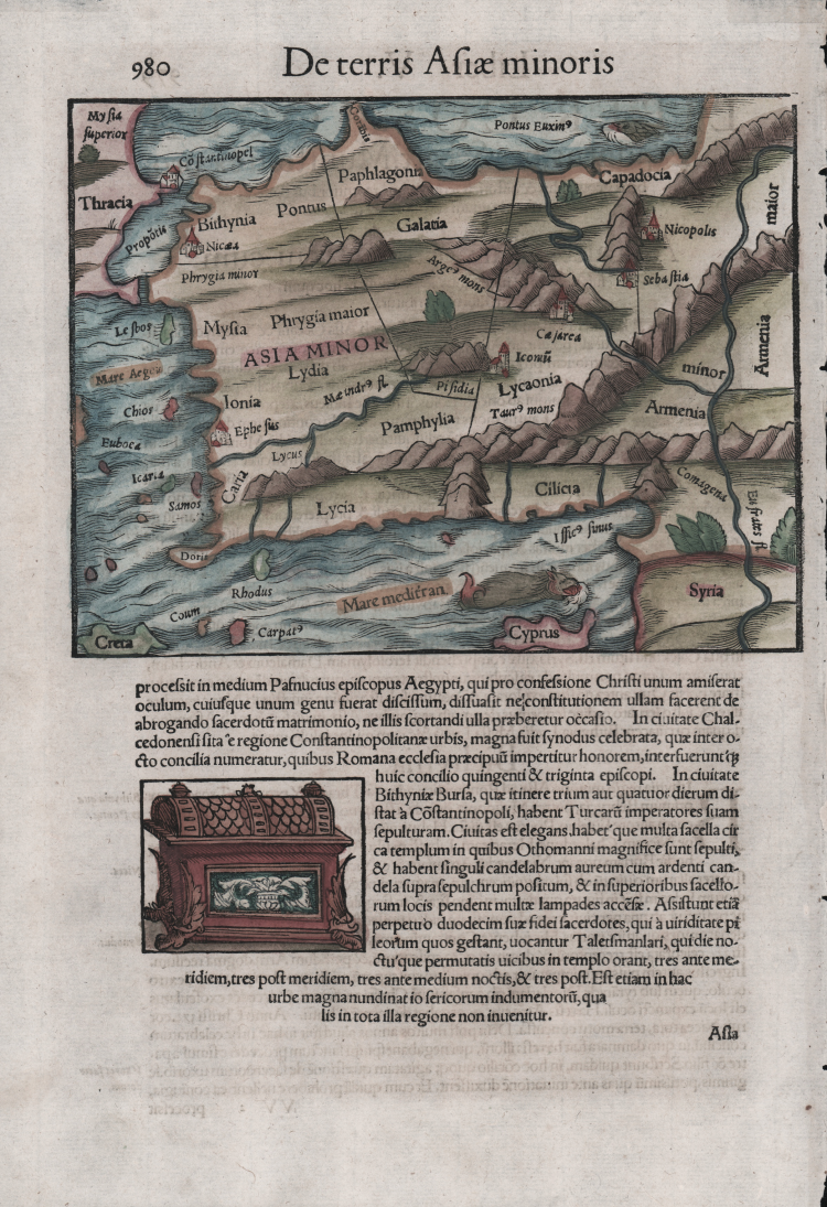 La Cosmographiae Universalis di Sebastian Münster (1488-1552), stampata per la prima volta Basilea nel 1544 dall’editore Heinrich Petri, venne più volte aggiornata e aumentata di nuove carte geografiche e rappresentazioni urbane nelle sue numerose edizioni che arrivano all’inizio del secolo successivo. Münster aveva lavorato a raccogliere informazioni al fine di ottenere un'opera che non deludesse le aspettative e, dopo un'ulteriore pubblicazione in tedesco abbellita da 910 stampe su legno, giunse nel 1550 all'edizione definitiva in latino, illustrata da 970 silografie.